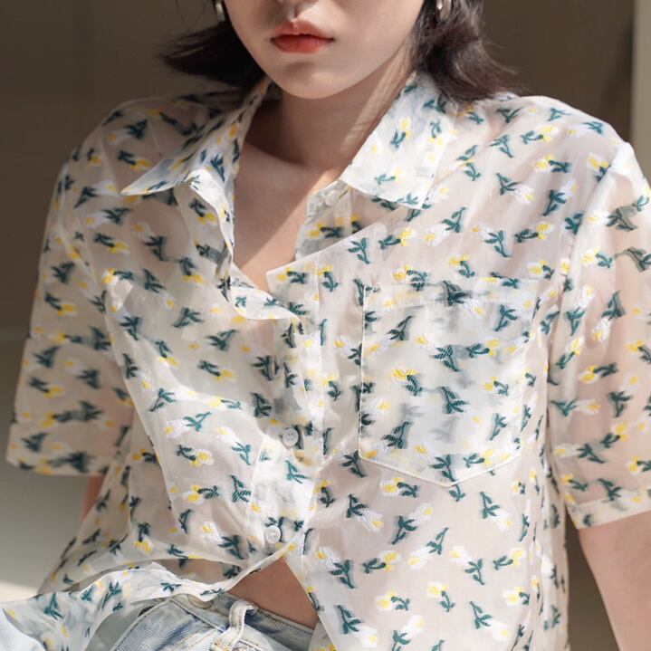 【送料無料】刺繍 フラワー シアー シャツ ブラウス トップス シースルー 春 夏