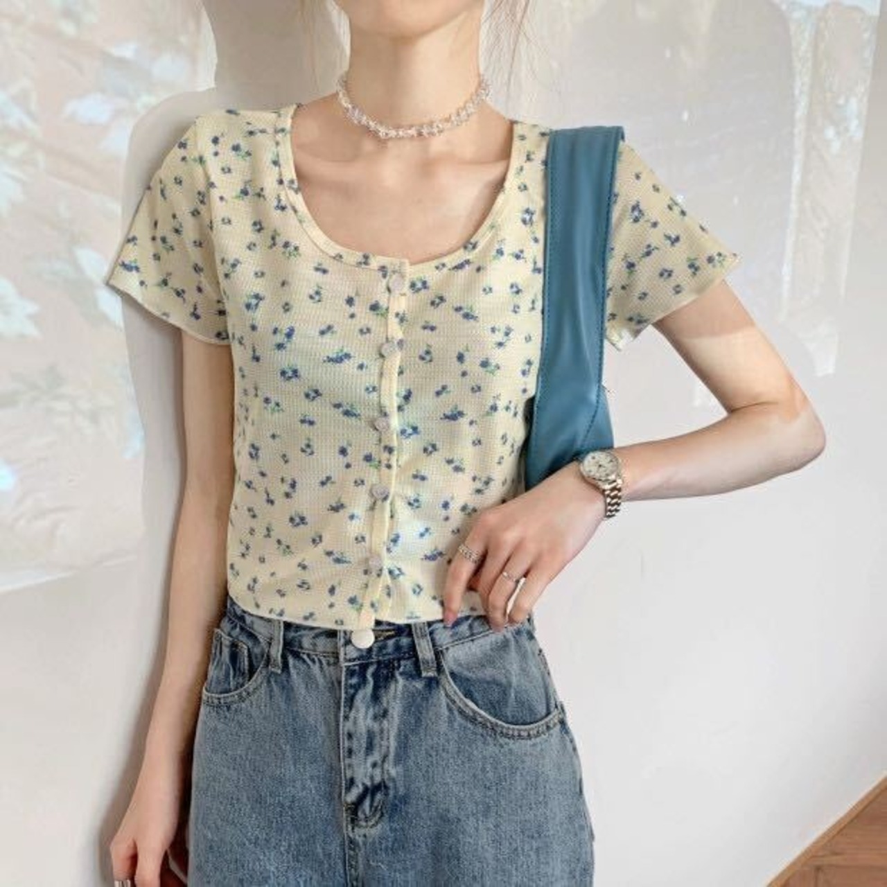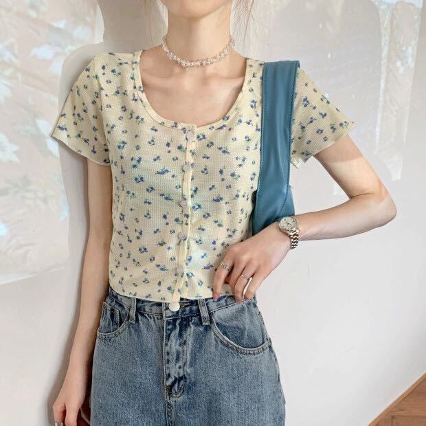 【送料無料】ブルー フラワー ワッフル トップス Tシャツ 半袖